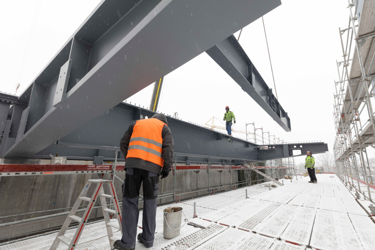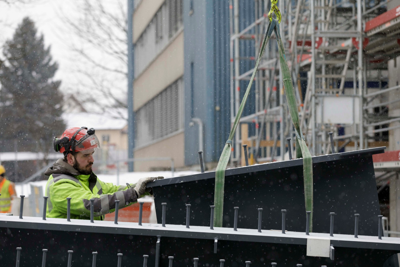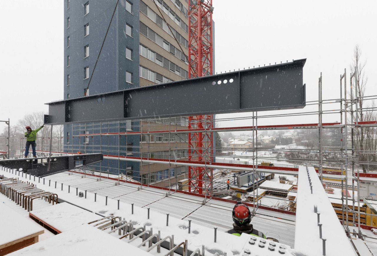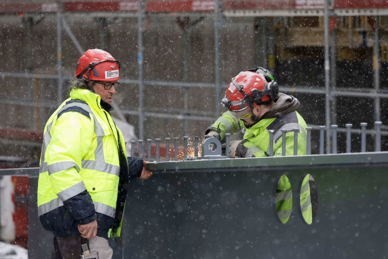 Kalte Temperaturen erschweren die Arbeit auf der Baustelle. Es ist beispielsweise zurzeit nicht möglich, zu betonieren. Problematisch dabei: mehrere Arbeiter verschiedener Firmen sind aufeinander angewiesen. Wenn einer mit seinen Arbeiten nicht fertig wird, können die anderen nicht fortfahren, was sehr schnell zum Verzug führt. Erschwerend kommt hinzu, dass nicht mehrere Etappen gleichzeitig gestartet werden können. Es werden viele vorproduzierte Fertigelemente verbaut, welche nicht beschädigt werden dürfen. Somit gilt jederzeit: Vorsicht trotz Zeitdruck!