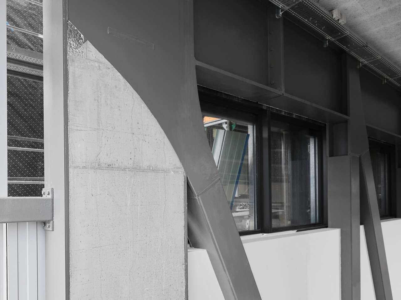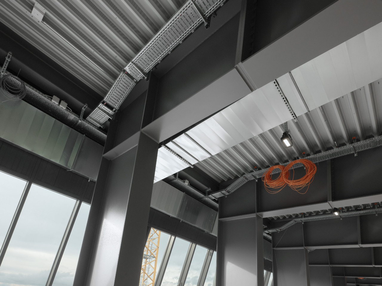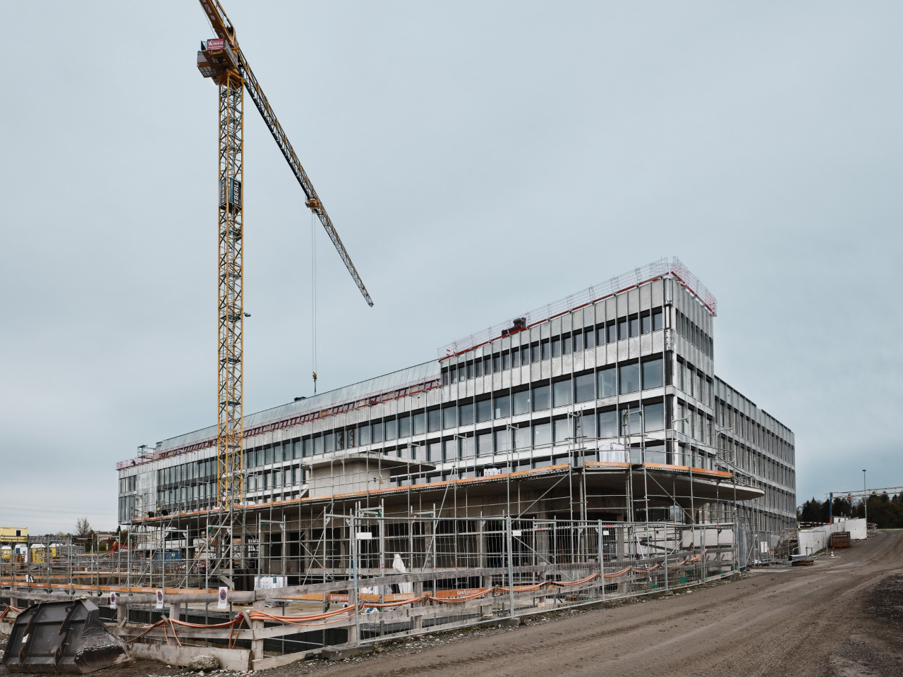 Auf der Baustelle steht ein 1'200 Tonnen Kran der Firma Welti Furrer. Der Kran ist derart gross, dass alle anderen Kranen auf der Baustelle stillstehen müssen, damit er komplett ausgefahren und genutzt werden kann. Auf dieser Baustelle werden sperrige und schwere Stahlträger verbaut. Das durchschnittliche Gewicht pro Stahlträger liegt zwischen 19 – 25 Tonnen. Die Lieferung der Stahlträger erfolgt „Just in Time“ – das heisst es wird geliefert und sofort montiert. Weil der Platz begrenzt ist, werden die Stahlträger auf der Baustelle direkt vom Lastwagen her an den Kran gehängt und verbaut. Pro Tag werden zwei Stützen mit dem Lastwagen geliefert. Das Ziel ist es, jeweils fünf Elemente bis zum Feierabend zu verbauen.