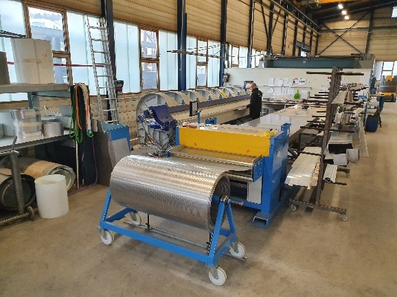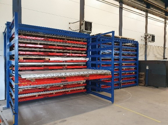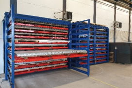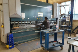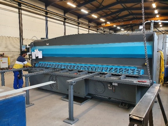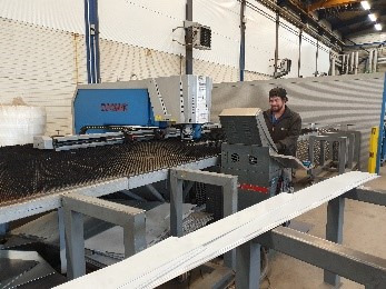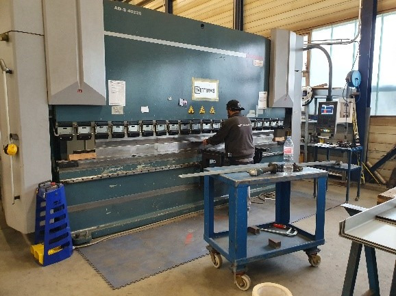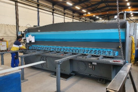 Unser Blechbearbeitungs-Center besteht aus einer Tafelschere, einer Langabkantmaschine, einer Abkantpresse, einem Schwerlast-Blechtafelregal und einem Stanzautomat.