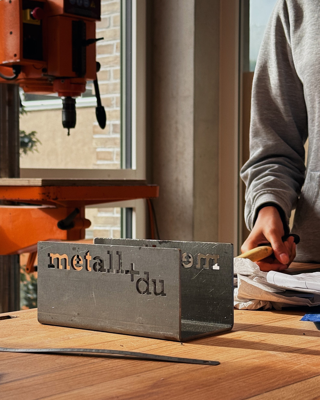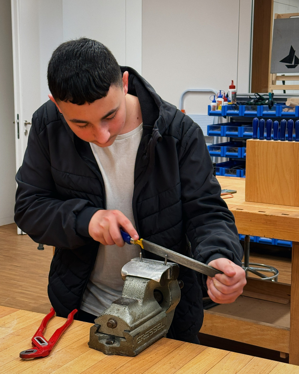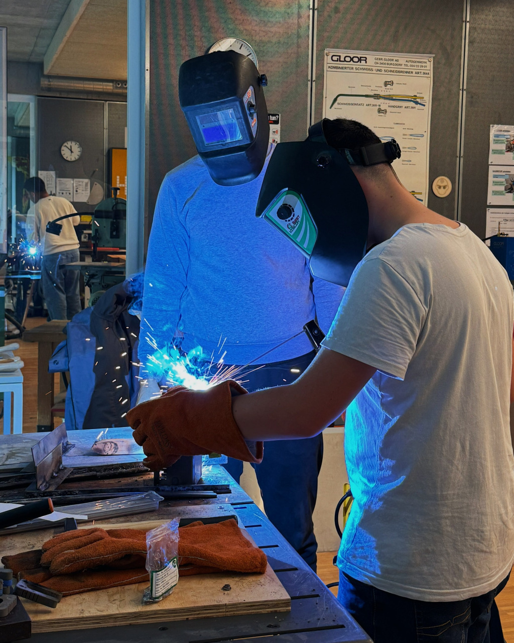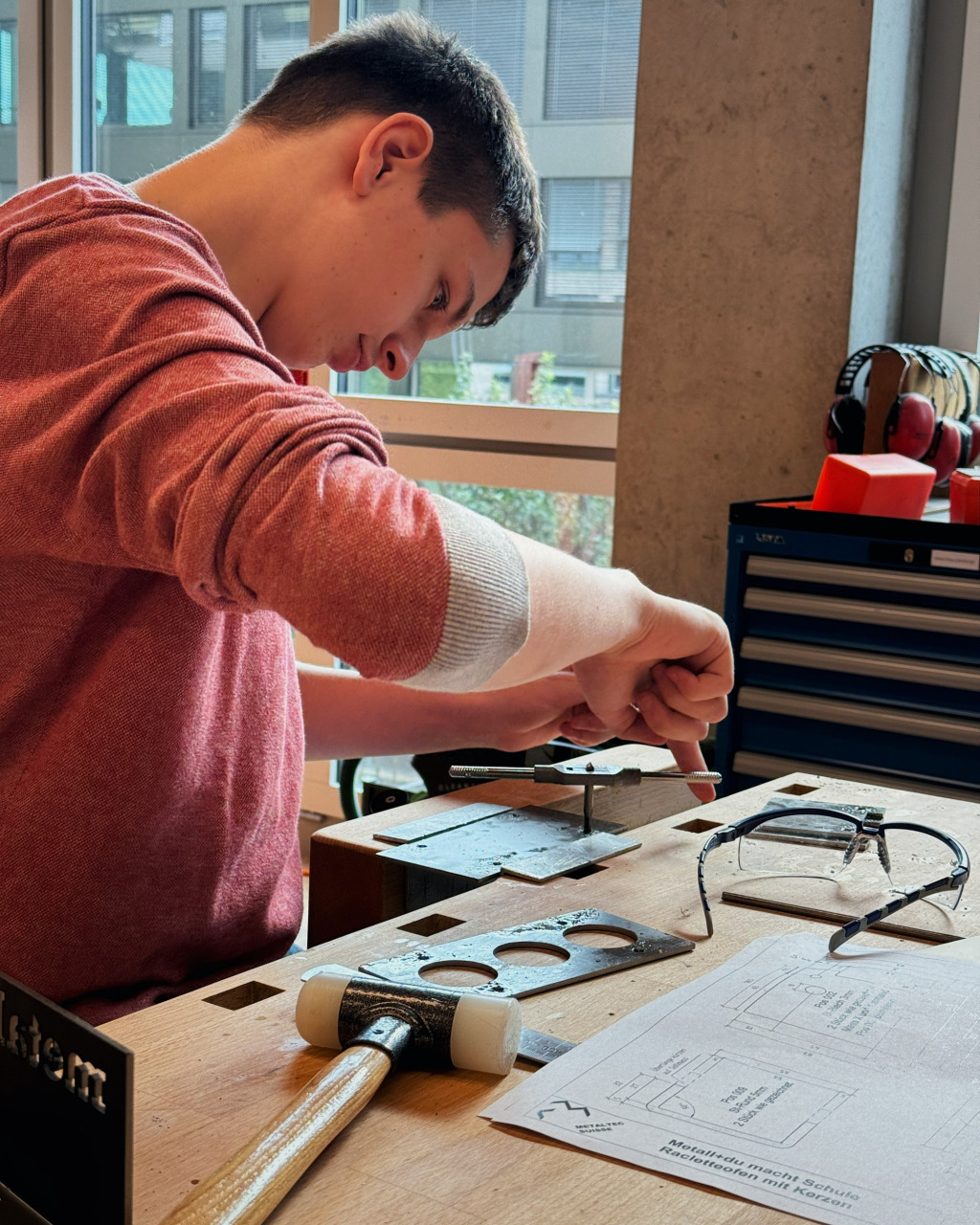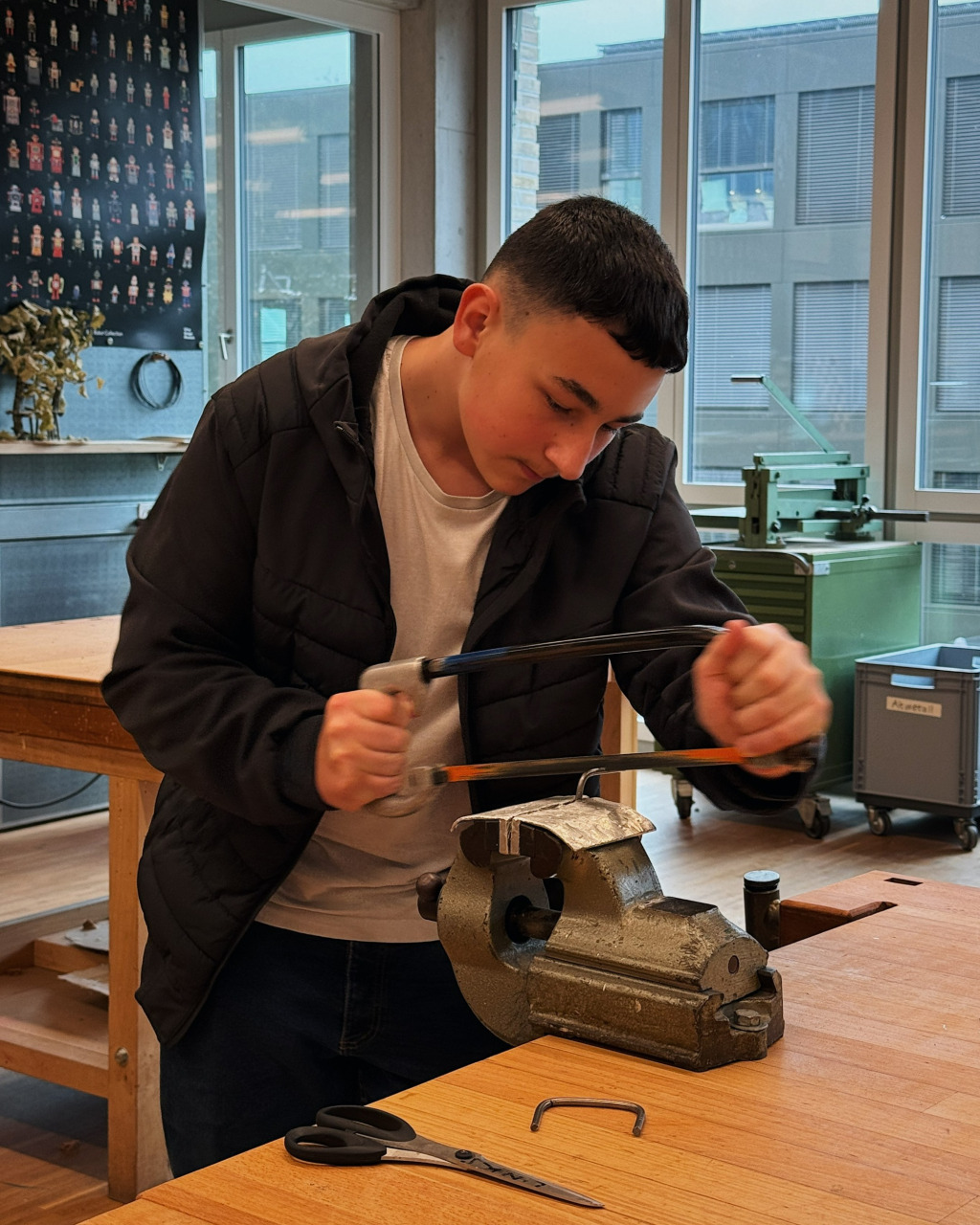 Unser Lernender Metallbauer EFZ Fachrichtung Stahlbau, Alessio, besucht regelmässig den Werkunterricht in Baden und teilt sein umfangreiches Wissen und seine Erfahrungen mit den Schüler*innen. Alessio erklärt geduldig die Schritte, die beim Zusammenbau des Raclette-Öfelis notwendig sind und zeigt ihnen, wie sie Metall sicher schneiden, biegen und formen können.