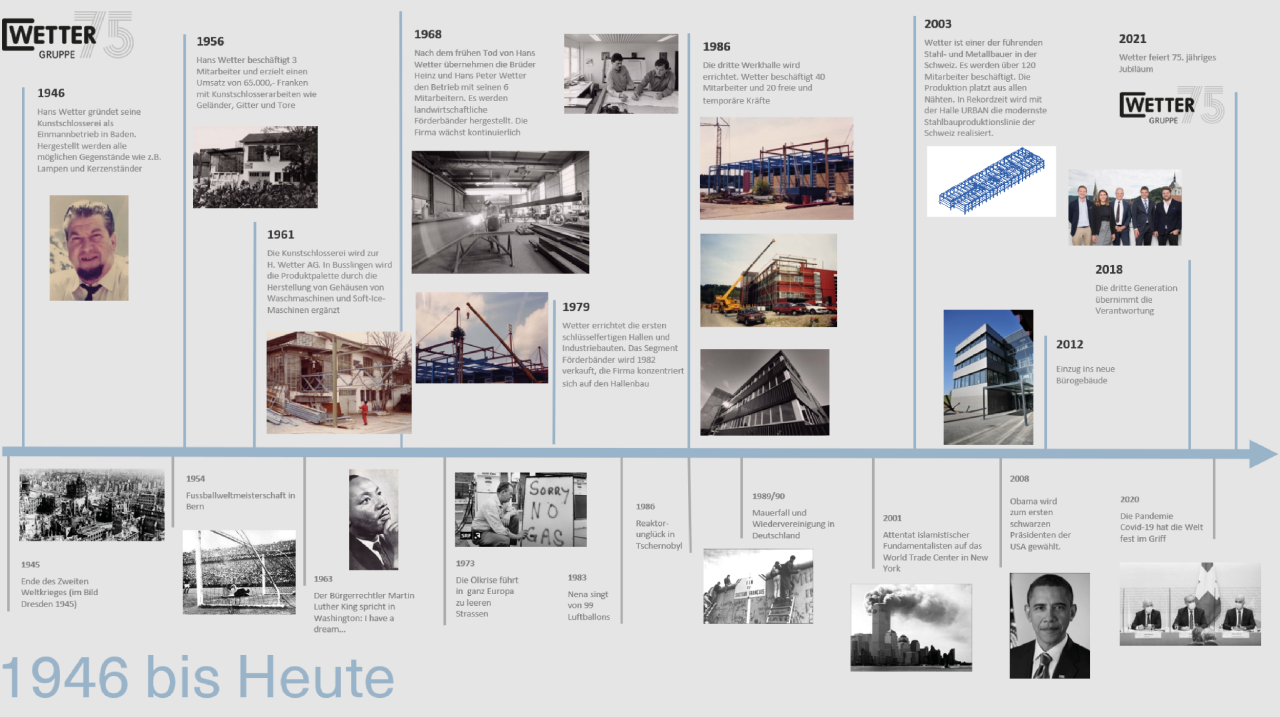 Wie entwickelt sich ein Unternehmen von der Einmann-Kunstschlosserei zur hochspezialisierten Unternehmensgruppe mit über 150 Mitarbeitenden? Ein Blick in unsere Geschichtsbücher offenbart das Erfolgsrezept der Wetter Gruppe, die während 75 Jahren gemeinsam mit ihren Kunden und Partnern über 15’000 Projekte realisiert und dabei stets umsichtig und mutig gehandelt hat. Ob die revolutionäre Herstellung von Förderbändern, die Errichtung einer 300-Meter-Halle in 19 Stunden oder eine der unzähligen weiteren Geschichten, die während vielen Jahrzehnten geschrieben wurden – es galt stets die Überzeugung «Geht nicht, gibt’s nicht.»